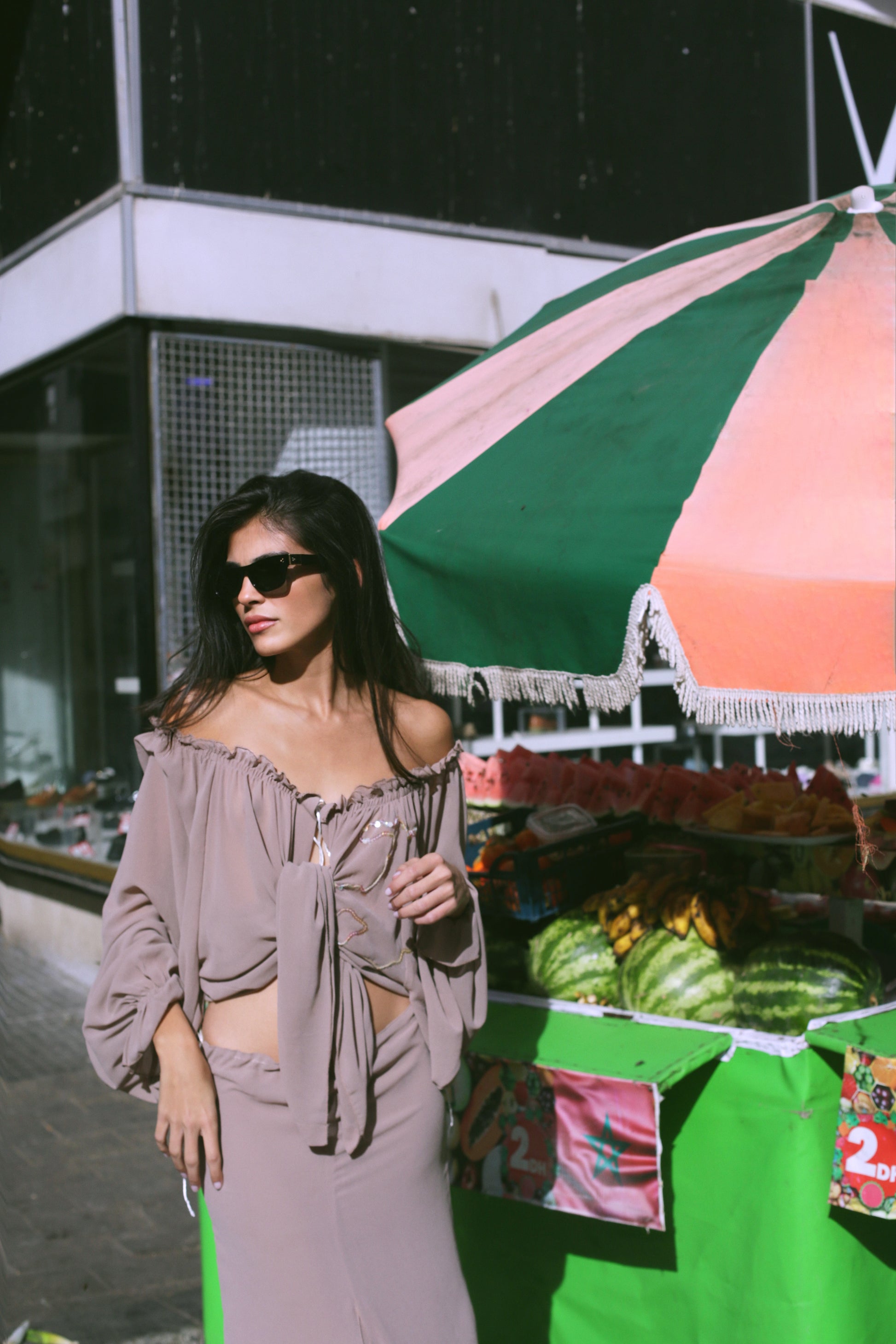 The off-shoulder blouse features adjustable ties for versatile styling, while the matching skirt skims the silhouette with ease. Designed to be worn together or separately, from day to golden hour. One size, adjustable for a flattering fit.